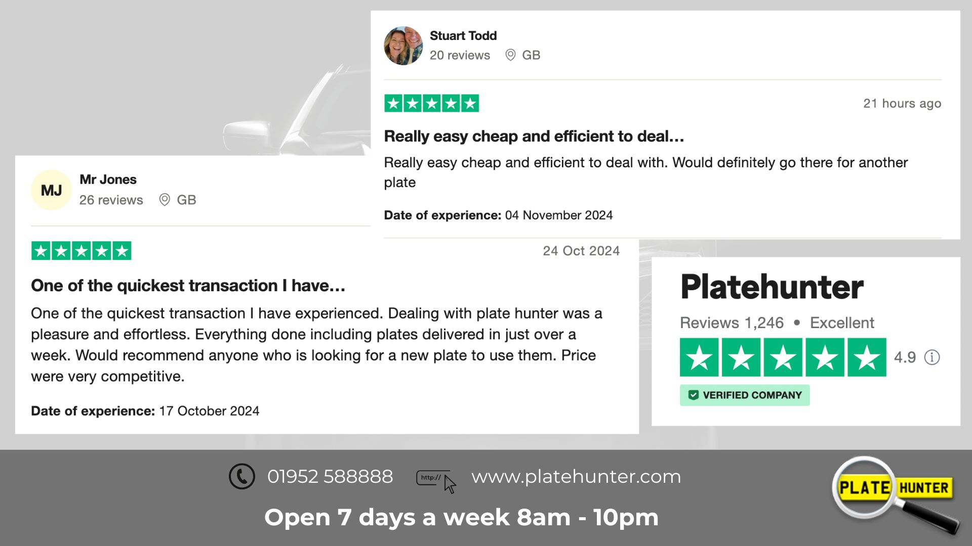 Review Centre: https://www.reviewcentre.com/Personalised_Number_Plates/Plate_Hunter_-_wwwplatehuntercom-reviews_1504683